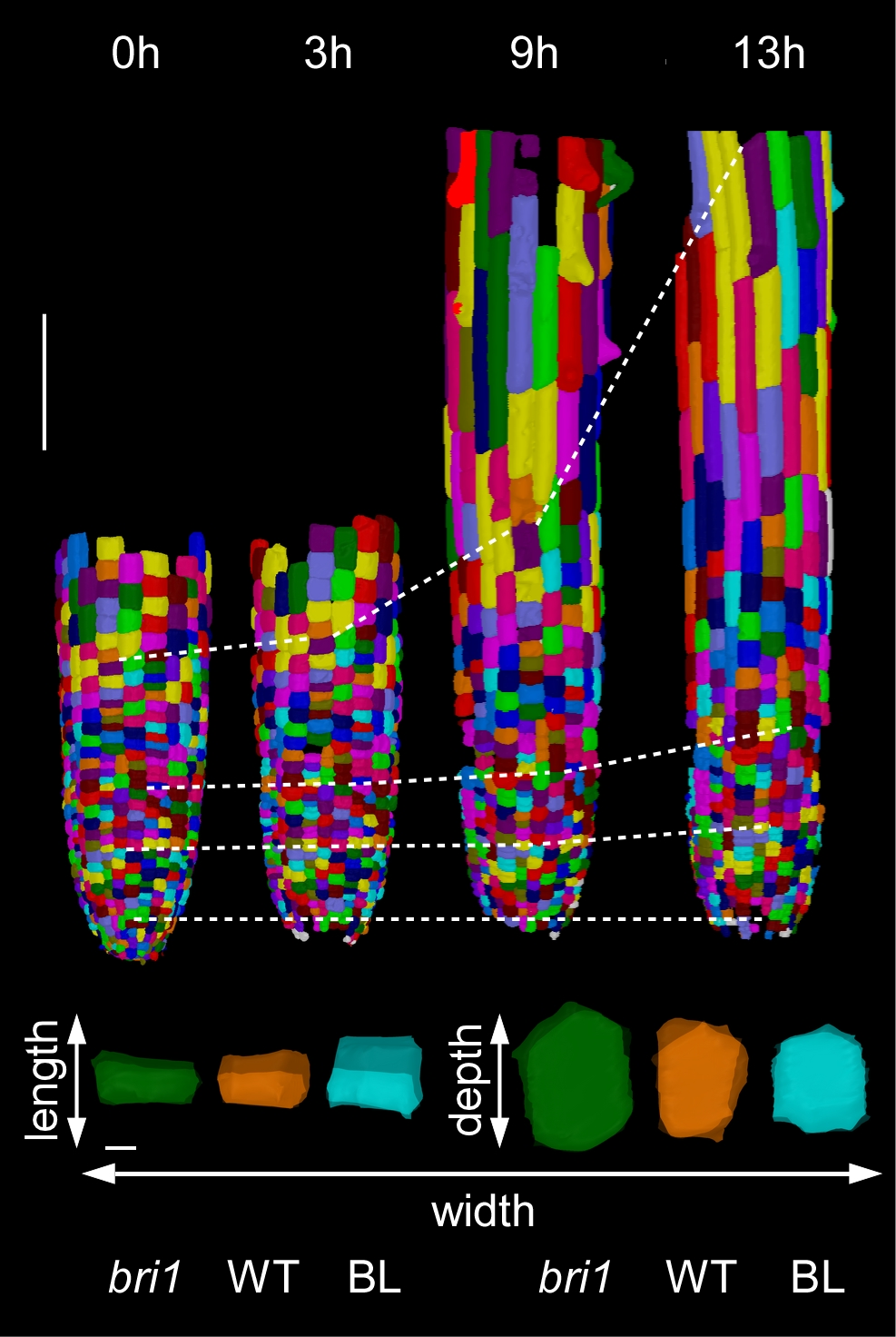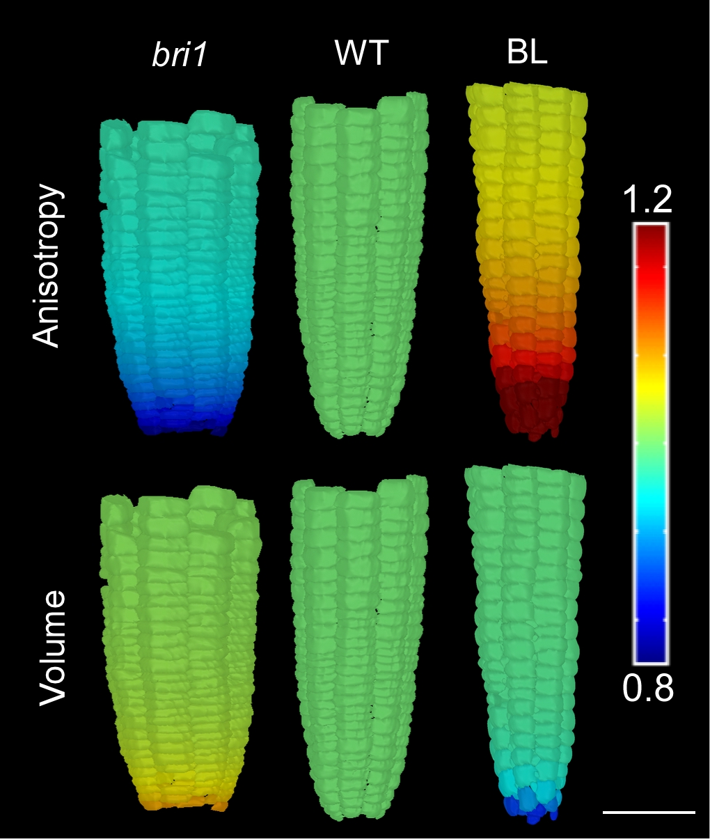 - תצוגה בתלת-מימד (3D) של רקמה אחת מתוך כלל הרקמות המרכיבות את מריסטמת השורש. כימות התאים ב-3D נעשה בשורשים שאין בהם תגובה להורמונים סטרואידיים (bri1), בשורשים עם רמות הורמון גבוהות מהרגיל (BL) ובזן הבר (WT). ניתן לראות בתצוגת heatmap כי רמות ההורמון קובעות את צורת התאים (anisotropy) במריסטמה, אולם אין להן השפעה על גודל התאים (נפח התא). גיאומטריה זו משפיעה על כיוון הגדילה של המריסטמה כולה.